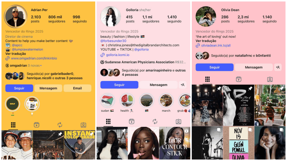 “Ok, Instagram, você conseguiu chamar minha atenção. Esses perfis com cores, no fundo, estão incríveis. Aparentemente, isso fazia parte de um concurso do Instagram. E esses aqui são os vencedores”, disse Geh, citando os criadores @oliviadeano, @golloria e @omgadrian, que já aparecem com o recurso ativo.