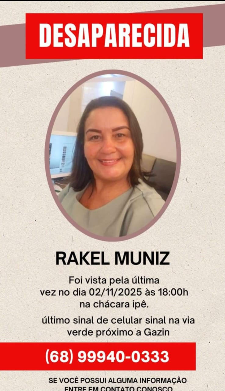 Quem tiver qualquer informação que ajude a encontrar Rakel Muniz pode entrar em contato pelo número (68) 99940-0333. A família reforça o pedido para que qualquer detalhe, mesmo que pareça pequeno, seja informado.