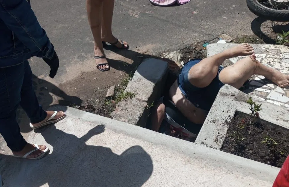 Com a força do impacto, a passageira que estava na garupa da motocicleta foi arremessada e acabou caindo dentro de um bueiro, sofrendo fraturas nas duas pernas.