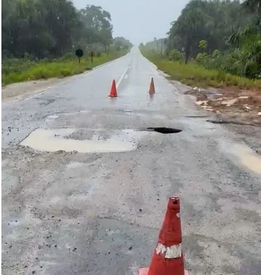 Segundo informações repassadas no local, o asfalto começou a ceder, abrindo uma cratera que oferece risco iminente a motoristas, especialmente veículos pesados como caminhões e carretas. Há perigo real de veículos descerem no buraco, o que poderia causar acidentes graves.