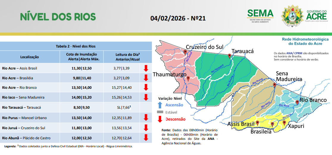 Em Rio Branco, a cota de alerta do Rio Acre é de 13,50 metros. Mesmo com a redução no nível, o volume de água segue acima do limite de transbordo, mantendo a atenção das autoridades e da população ribeirinha.