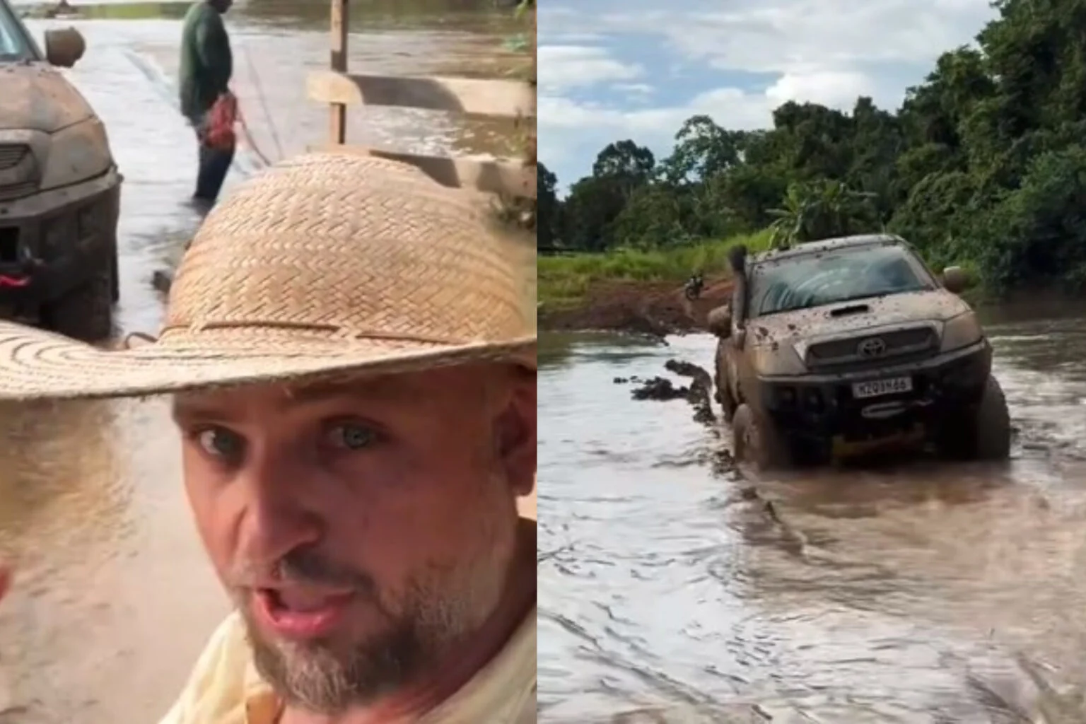 Logo no início das imagens, Lorim relata o susto: “É hoje! Ia dar errado aqui pra Hilux Confusão. Fomos atravessar o Rio Antimary, o carro caiu lá na cabeceira da ponte”.