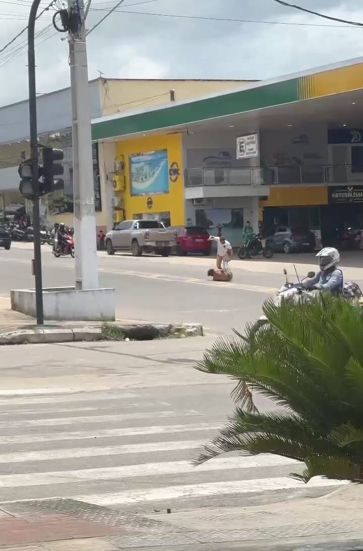 Imagens feitas por um cinegrafista amador registraram o momento em que um homem, ainda não identificado, agride um morador de rua nas proximidades de um posto de combustíveis, praticamente em plena via pública.