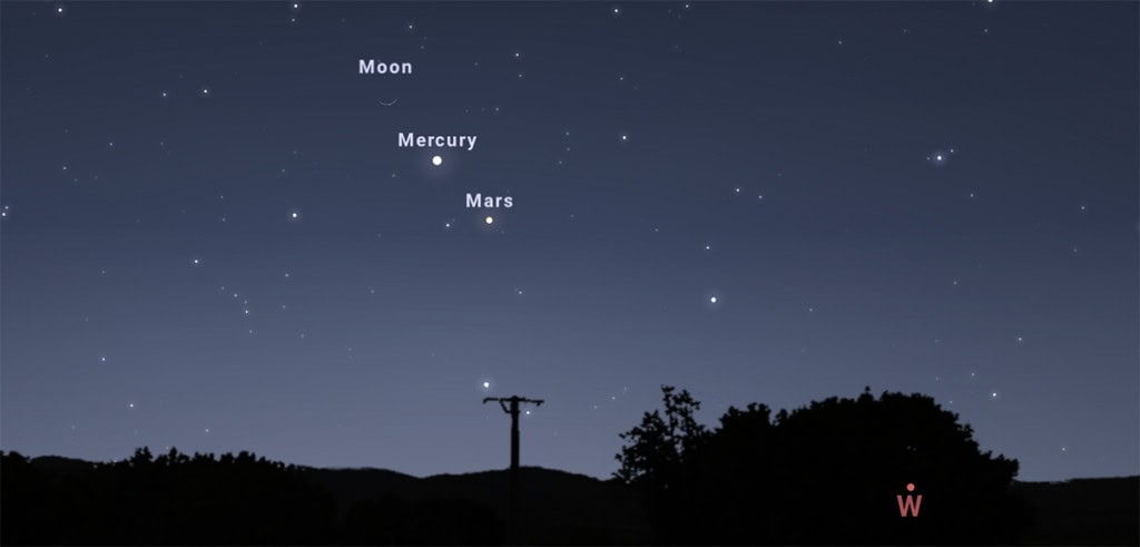 Melhor momento de observação da Lua próxima de Mercúrio e Marte no céu desta quinta-feira (23). Crédito: Stellarium